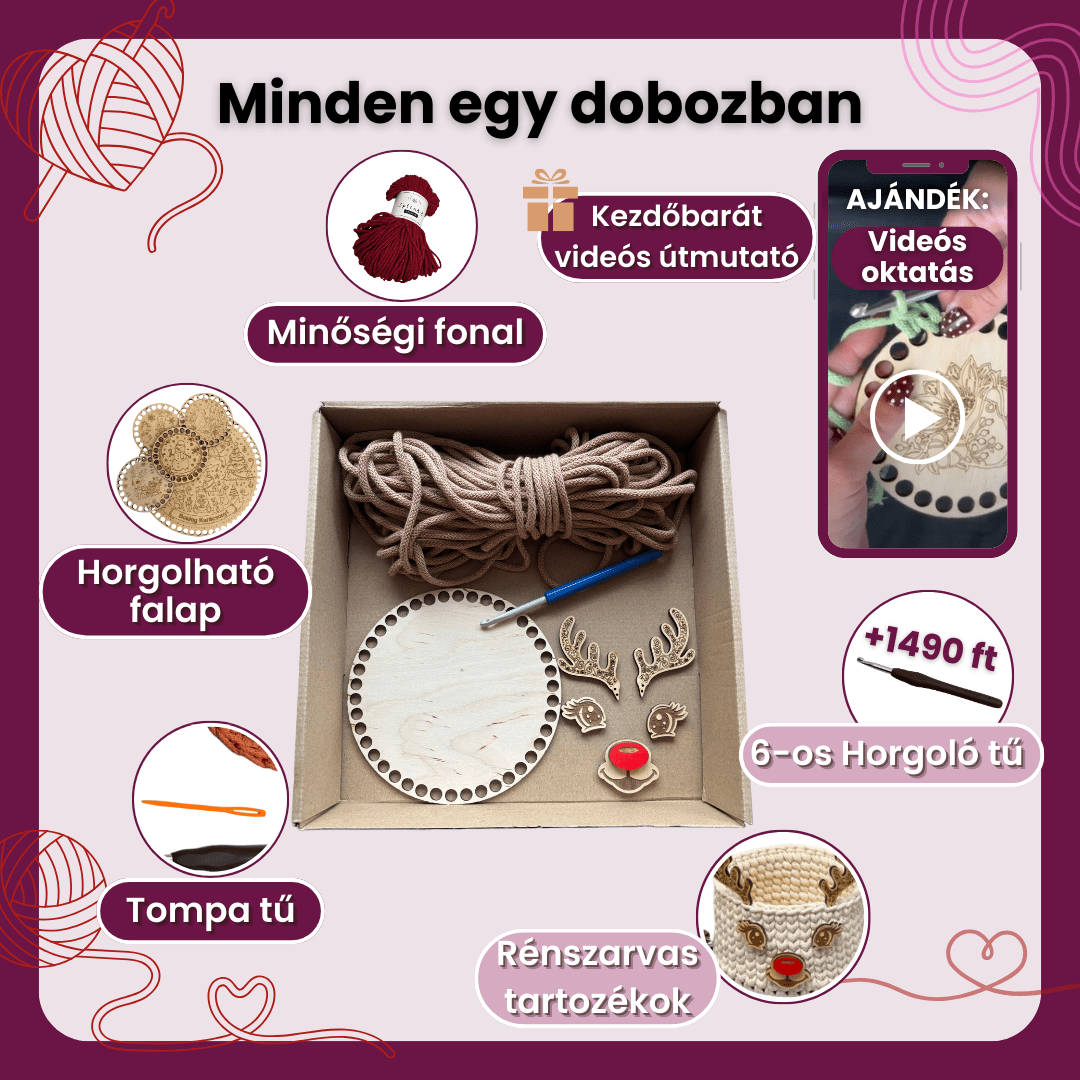 Mindenki kap a csomagjában egy QR kódot, illetve egy oldal elérést, amin keresztül eléri a videókat, ahol bemutatunk minden lépést, ahhoz, hogy bárki meg tudja horgolni, teljesen kezdőként is.